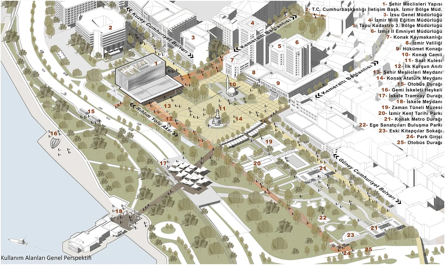 Bu doğrultuda, Şehir Meclisleri Meydanı’nın bir araya gelmeyi ve etkin katılımı destekleyen kurgusu, Konak Atatürk Meydanı ile güçlü etkileşim içinde çevresel akslar ve Rıhtım Yolu Aksı üzerinde konumlanan Şehir Meclisleri Yapısı’nın esnek kullanım üzerinden çeşitlilik içeren kamusal altlığı bu alanın bir Anıt Yapı/Kurum olarak öne çıkmasını ve kentli tarafından bir bir araya gelme odağı olarak kullanılmasını beraberinde getirecektir.